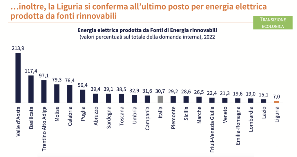 Senza tanti giri di parole, il dato che balza subito all’occhio è il poco onorevole ultimo posto nazionale alla voce “Energia elettrica prodotta da fonti rinnovabili”. La Liguria, con il suo 7%, è da sola e distaccata in coda alla classifica con un netto divario da tutte le altre. Basti pensare che il Lazio, penultimo, arriva al 15,1%. Al primo posto nazionale, invece, c’è l’inarrivabile Valle d’Aosta con il suo 213,9% (valori percentuali sul totale della domanda interna). Praticamente un altro mondo.