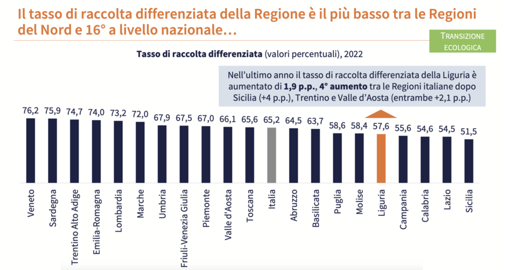 La poca propensione alle tematiche ambientali emerge anche da un altro dato inserito nel report. Siamo alla voce “raccolta differenziata” e qui la Liguria abbandona l’ultimo posto, ma resta sempre in zona retrocessione piazzandosi 16ª e ultima tra le regioni del Nord con il suo 57,6% (dato del 2022). Dietro ci sono solamente Campania (55,6%), Calabria (54,6%), Lazio (54,5%) e Sicilia (51,5%).