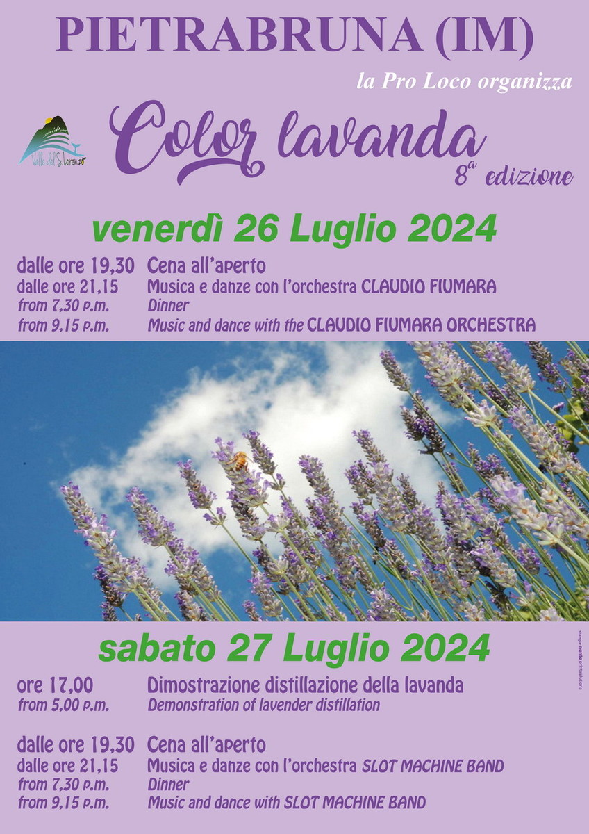 19.30. Festa della lavanda: serata all'insegna della buona musica e del buon cibo: ravioli, grigliata, fiorentine, deliziosi dolci, il tutto innaffiato da buon vino e birra artigianale. Piazza del paese, anche domani (locandina)