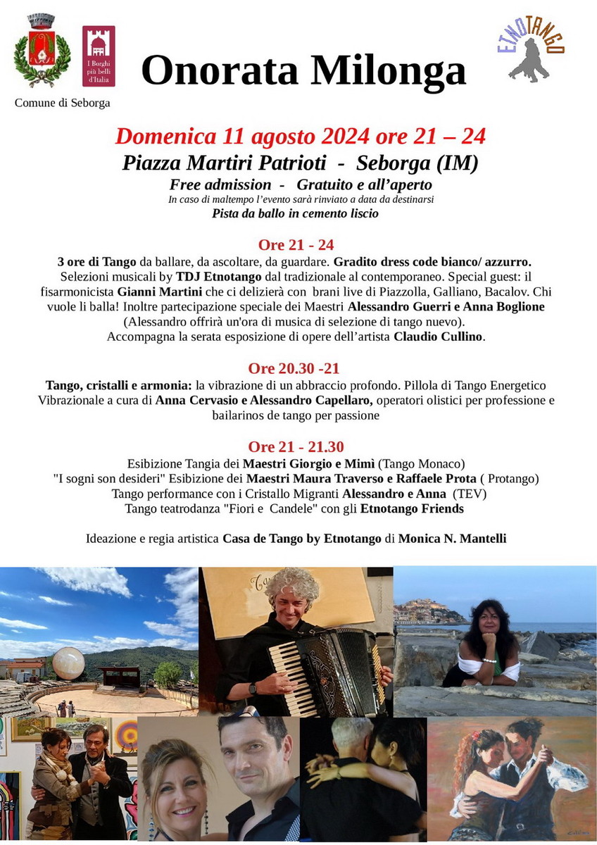 21.00-24.00. ‘Onorata Milonga’ (1ª edizione): evento a cura di Casa de Tango by Etnotango con la partecipazione di un affermato musicista ligure, varie coppie di Maestri di Tango in esibizione e tanti bailarinos sulle selezioni dei Dj ospiti, da Torino e da Imperia. Anfiteatro di piazza Martiri Patrioti (per più dettagli leggere la locandina)