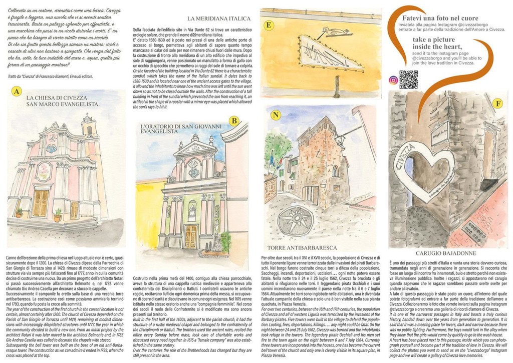 La chiesa di San Marco, l’oratorio di san Giovanni e la torre antibarbaresca tra i luoghi del cuore dipinti sulla mappa. Non manca anche il “carugio bajadonne”, un passaggio strettissimo, largo circa 60 centimetri, dove si racconta i giovani si nascondessero in attesa delle ragazze dirette al lavatoio, a cui cercavano di strappare un bacio: “Già due anni fa abbiamo cercato di promuovere questo luogo, abbiamo posizionato un cuore dove gli innamorati possono fotografarsi. Chi vuole può inviare la foto a @civezzaborgo, la nostra pagina Instagram, e noi la posteremo tra i ricordi d’amore di Civezza”, conclude Novelli.