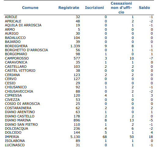 La consistenza delle iscrizioni e cessazioni d’impresa nel secondo trimestre dell’anno nella provincia di Imperia suddivisa per comuni: