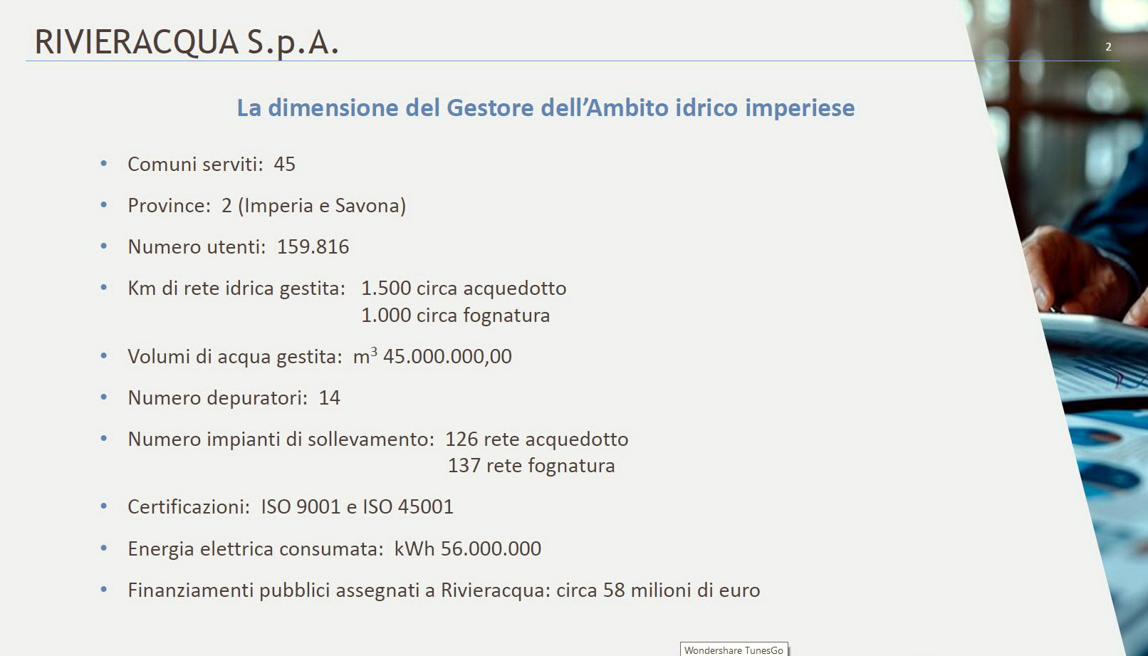 E’ stato fatto un quadro delle dimensioni dell’azienda Rivieracqua che serve 45 comuni, tra le province di Savona (Andora, Testico e Stellanello) ed Imperia. Sono 159mila gli utenti serviti, su una rete idrica di 1.500 km di acquedotto e 1.000 di fognatura. L’azienda gestisce l’intero ciclo delle acque per un volume di circa 45 milioni di metri cubi. Sono 14 i depuratori utilizzati con 126 impianti di sollevamento per l’acquedotto e 137 per le fognature. Il totale dell’energia elettrica consumata è di 56 milioni di Kilowatt. Rivieracqua ha ricevuto finanziamenti pubblici per circa 58 milioni di euro, che vengono utilizzati per le reti idriche e fognarie.