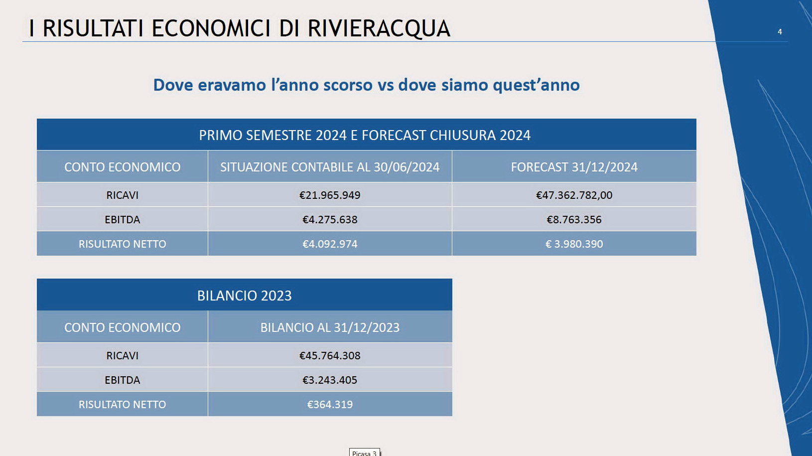 Il bilancio di chiusura del 2023 vede un risultato netto di circa 400mila euro mentre, per l’anno che sta per terminare sono previsti ricavi per circa 4 milioni di euro, che va a decuplicare i risultati dello scorso anno. “L’obiettivo – ha detto Angela Ferrari – è quello di potenziar e risanare le reti di distribuzione, con interventi di manutenzione straordinaria e strategici sulle condotte”. Lavori che serviranno a prevenire situazioni critiche per l’approvvigionamento idrico dei cittadini. In previsione anche lavori legati al cosiddetto ‘Masterplan’, ultimato per l’80% a Sanremo.