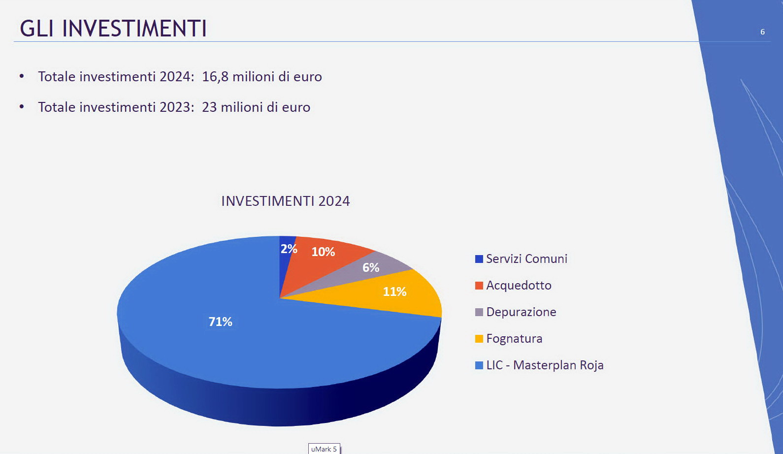Per quanto riguarda gli investimenti il totale del 2024 è di 16,8 milioni di euro, rispetto ai 23 del 2023. Lavori eseguiti con contributi di Regione, comune di Andora e dal Pnrr. Nell’anno in corso l’investimento più alto riguarda il ‘Masterplan’, per circa 40 milioni di euro, suddivisi equamente tra Sanremo, Imperia, il dianese ed Andora. Nel 2024 sono stati sostituiti più di 3 km di condotte mentre, entro il 2026, verranno investiti 18,5 milioni di fondi Pnrr con 1,5 di quota Rivieracqua per la riduzione delle perdite nelle reti di distribuzione anche con la digitalizzazione ed il monitoraggio delle reti.