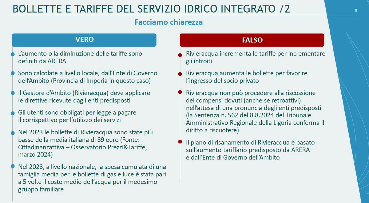 Rivieracqua respinge le accuse relative al possibile incremento delle tariffe per incrementare gli introiti: “Stessa situazione – prosegue Ferrari – per quanto riguarda l’ingresso del privato che non prevede assolutamente aumenti. Noi non possiamo procedere alla riscossione dei compensi retroattivi dovuti, in attesa della pronuncia degli enti predisposti (il Tar Liguria ha comunque sancito nell’agosto scorso che Rivieracqua ha diritto a riscuotere). E’ anche falso che il piano di risanamento dell’azienda sia basato sull’aumento tariffario predisposto da Arera e dalla Provincia”.