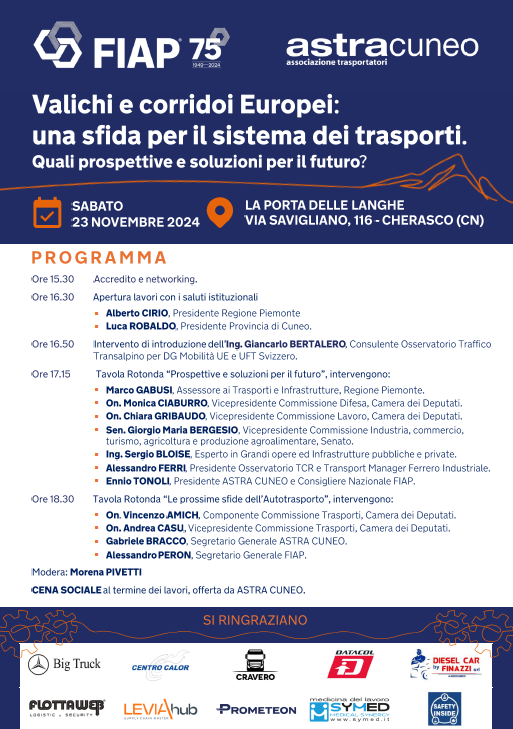 Parteciperanno in qualità di relatori anche il Dott. Alessandro Ferri Presidente dell’Osservatorio TCR e Transport Manager Ferrero Industriale, l’Ing. Sergio Bloise, Esperto in Realizzazione e Gestione di Grandi Opere ed Infrastrutture, il Presidente ASTRA CUNEO Ennio Tonoli, il Segretario Generale ASTRA CUNEO Gabriele Bracco ed il Segretario Generale FIAP Alessandro Peron.