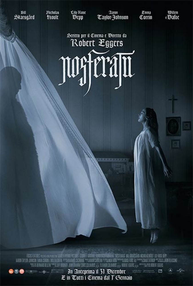- NOSFERATU – ore 15.45 – di Robert Eggers - con Aaron Taylor-Johnson, Bill Skarsgård, Nicholas Hoult, Lily-Rose Depp, Emma Corrin – Horror/Fantasy – “In Germania, a Wisborg, nel 1838, Thomas Hutter, novello sposo della bellissima Ellen, viene inviato dall'agenzia immobiliare per cui lavora, in una remota residenza dei Carpazi. Appena arrivato nella regione è tormentato da incubi e assiste a barbariche pratiche locali, inoltre a portarlo nel castello del conte Orlock arriva una carrozza misteriosamente senza cocchiere. Il conte pretende che lui firmi un contratto in una lingua antica e incomprensibile. Solo troppo tardi Hutter ne scopre la natura di non-morto ma, incapace di contrastarlo, si rifugia nella propria camera. Quando la creatura lascia il maniero per la città, per avvicinarsi a Ellen dalla quale è ossessionato già dall'adolescenza di lei, Hutter rischierà la vita pur di fuggire. Nel mentre Orlock ha scatenato una pestilenza a Wisborg, che gli permette di agire indisturbato. Darà a Ellen tre giorni di tempo per cedere alla sua mortale corte...”