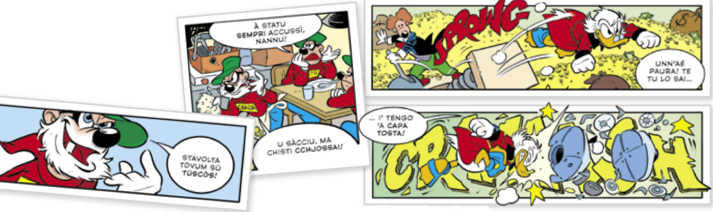 Alcune vignette della storia “Zio Paperone e il Pdp6000” scritte nei diversi dialetti utilizzati