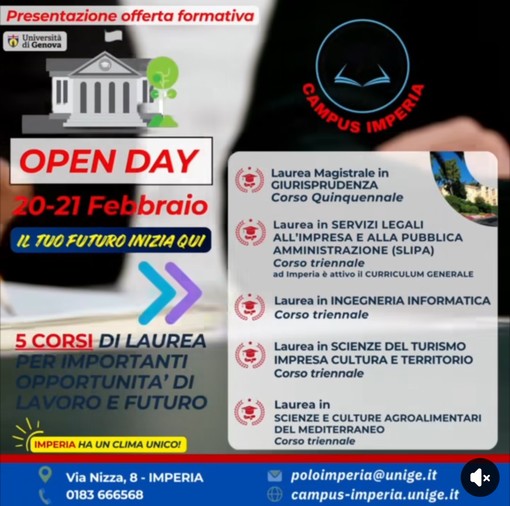 L’occasione sarà unica per conoscere l’intera offerta formativa dell’Università di Genova, in particolare i 5 corsi di laurea che si possono trovare ad Imperia.