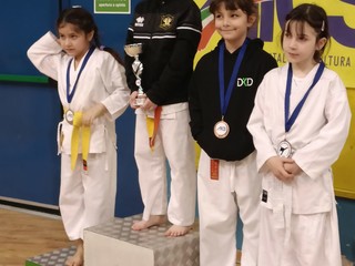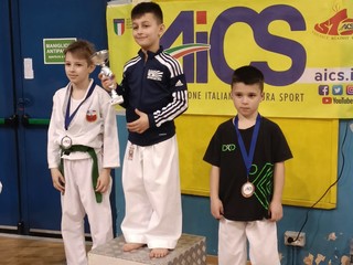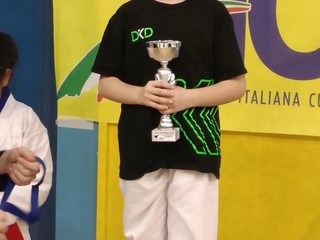 Poi è la volta del combattivo Dionis Nushi, U10 30kg maschile: lotta punto su punto, e porta a casa un Bronzo che ha il sapore dell’Oro, per la grinta.