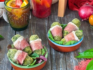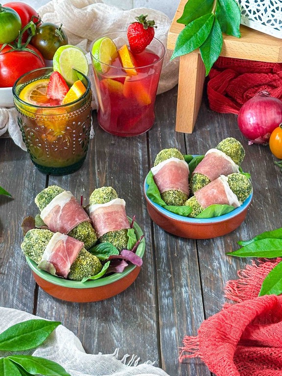 La prima proposta è una reinterpretazione creativa di una ricetta andalusa: le crocchette di ceci e spinaci con Prosciutto Crudo. Ispirate all’“espinacas con garbanzos” tipica di Siviglia, queste crocchette offrono un contrasto interessante tra il cuore morbido e aromatico di ceci e spinaci e la sapidità avvolgente del Prosciutto Crudo. Passate in forno o fritte per una croccantezza perfetta, sono infine bardate con sottili fette di prosciutto, ideali da gustare calde con una leggera salsa in accompagnamento.