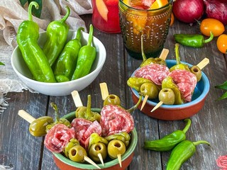 Preparazione: Per preparare gli spiedini lavare bene i friggitelli, scaldare l’olio in pentola antiaderente e rosolare a fiamma alta. Abbassare la fiamma, coprire con coperchio e proseguire la cottura fino a quando risulteranno morbidi. Lasciare raffreddare e comporre gli spiedini infilzando una oliva, la parte superiore del peperone, una fetta di salame, la codina del peperone e un’altra oliva a chiudere.