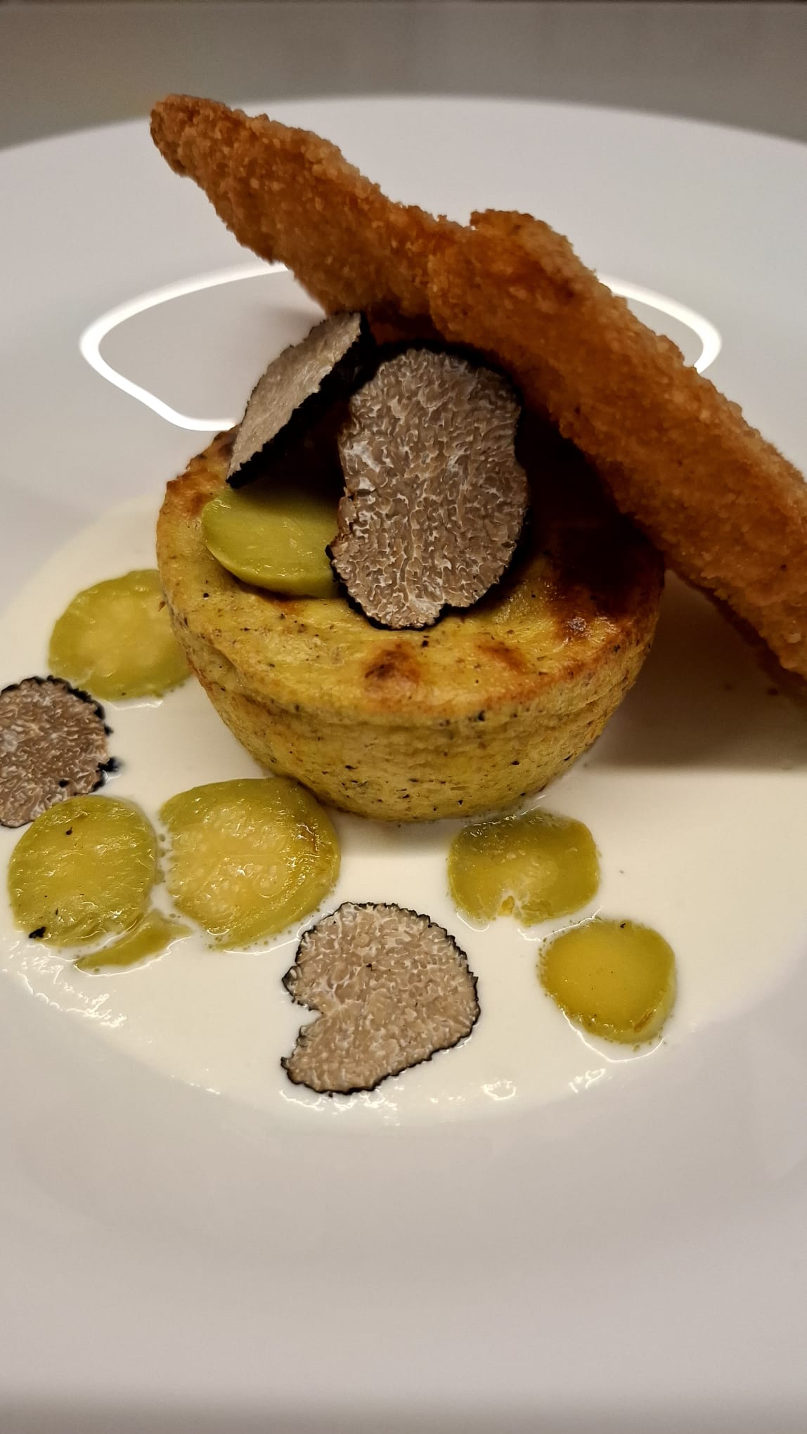 - Uno sformatino di zucchine trombetta, crema di burrata, petali di tartufo nero e fiore di zucchina impanato: un piatto delicato ma ricco di personalità, interamente giocato su consistenze e aromi.