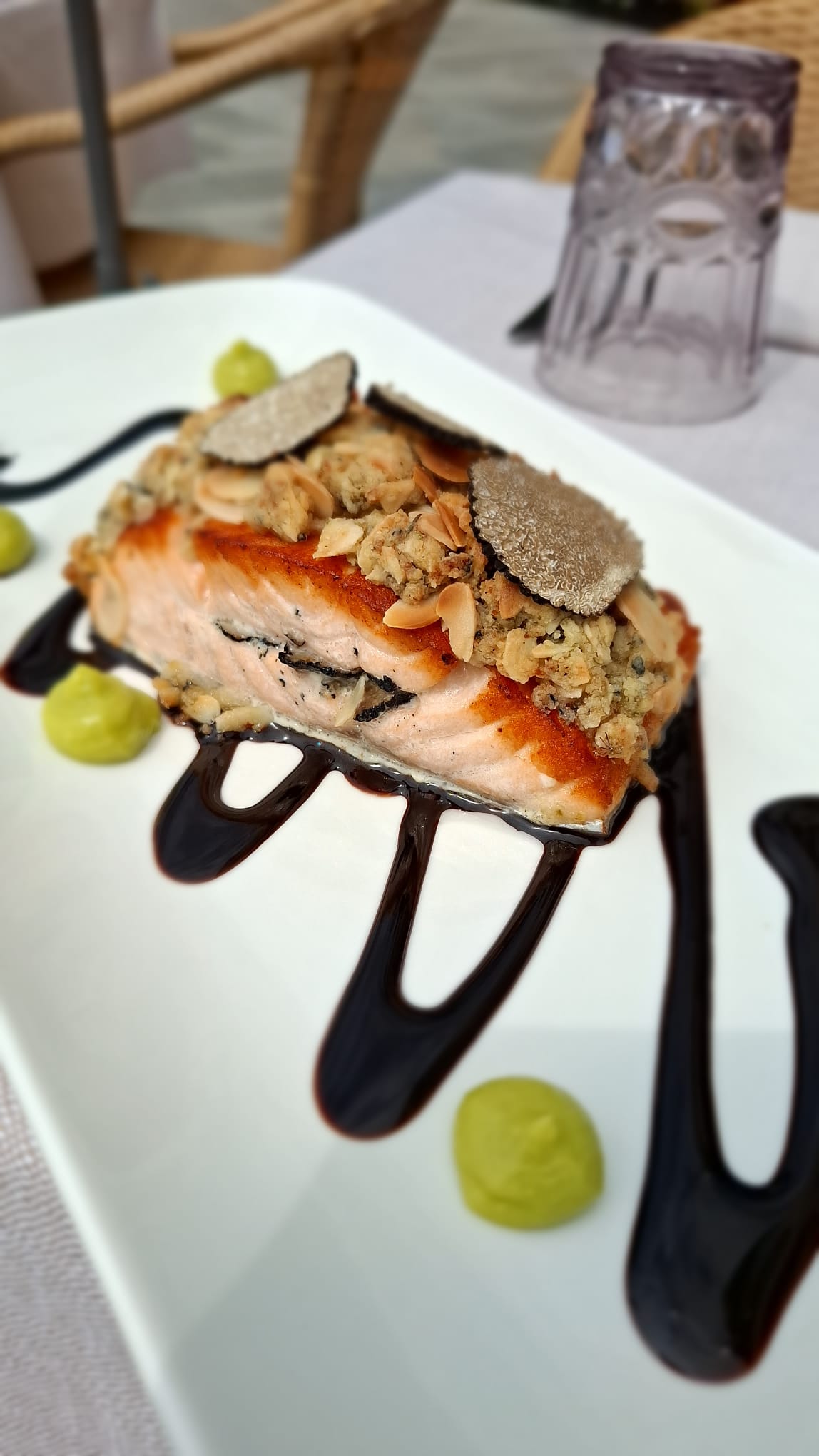 - Un trancio di salmone in doppia farcia: una interna, con patata e tartufo; l’altra, croccante, con mandorle e tartufo. A completare, una salsa al cioccolato fondente e una crema di lime e avocado, che esalta la ricetta con un tocco esotico e vellutato.
