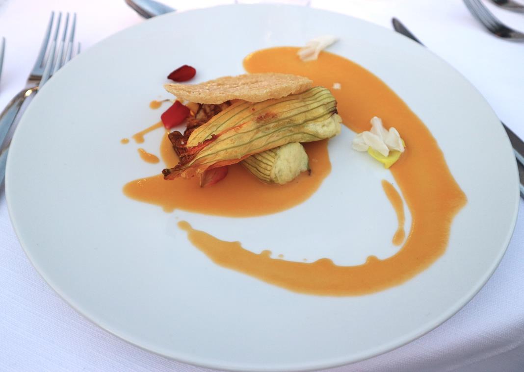 · Fiori di zucca farciti con ricotta e maggiorana, accompagnati da petali di Bocca di Leone, cremoso al datterino giallo e cialda croccante di Parmigiano Reggiano