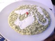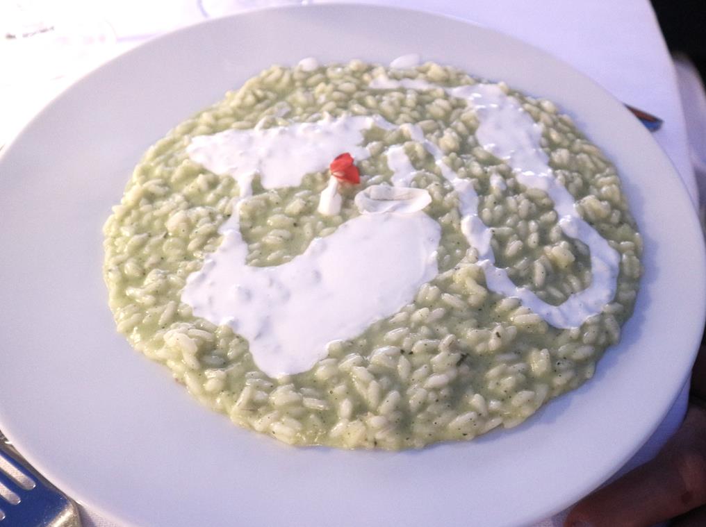 · Risotto mantecato con purea di zucchine trombetta al profumo di Nasturzio, spuma leggera di burrata e petali di Begonia
