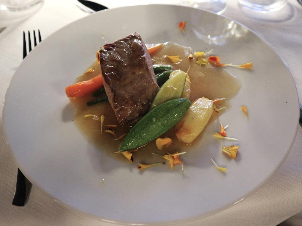 · Filetto di maialino al profumo di Timo, con verdure baby glassate e salsa al Tagete