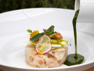 • Condire la guarnizione con sale e olio d’oliva. Disporla con cura e in volume sopra il ceviche di branzino.