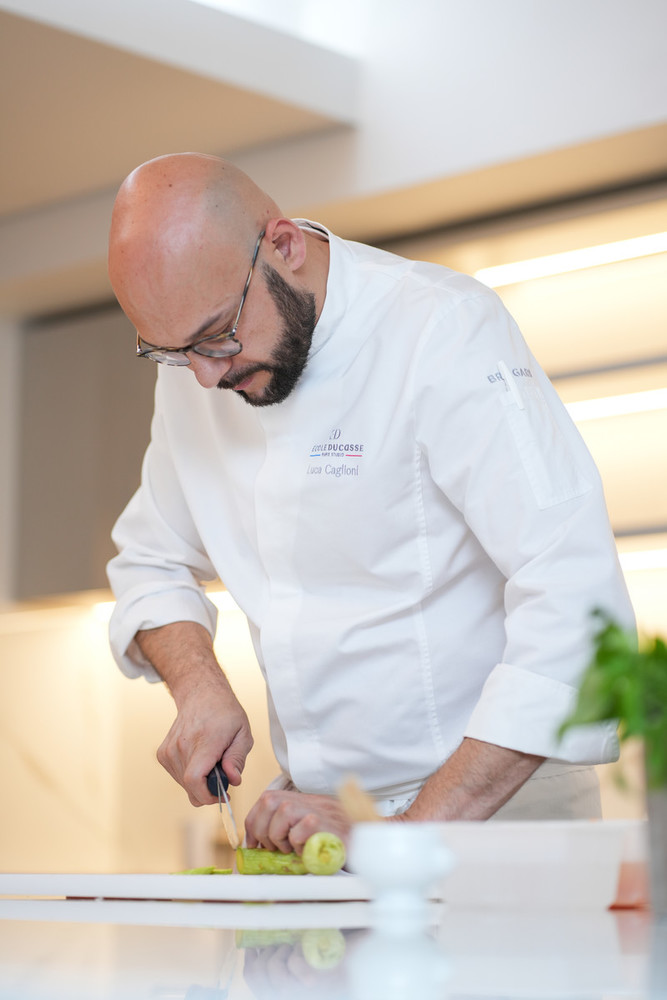 Originario della Lombardia e figlio di artigiani, Luca Caglioni è laureato in ospitalità e vanta un solido percorso accanto a chef di fama come Fabrizio Garatti, Massimo Civale, Joël Preud'homme e Patrick Laurent. Nel 2006 si trasferisce a Parigi, dove entra nel team del ristorante dell’Hôtel Lotti, celebre punto di riferimento per la gastronomia italiana. Successivamente guida le cucine de Le Purgatoire 54-Paradis, luogo iconico per eventi culinari nella capitale francese. Ispirato dalla filosofia di Alain Ducasse, Caglioni entra nel gruppo nel 2021: prima come training chef al Campus di Meudon, poi come Executive Chef dell’École Ducasse Paris Studio