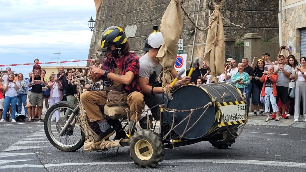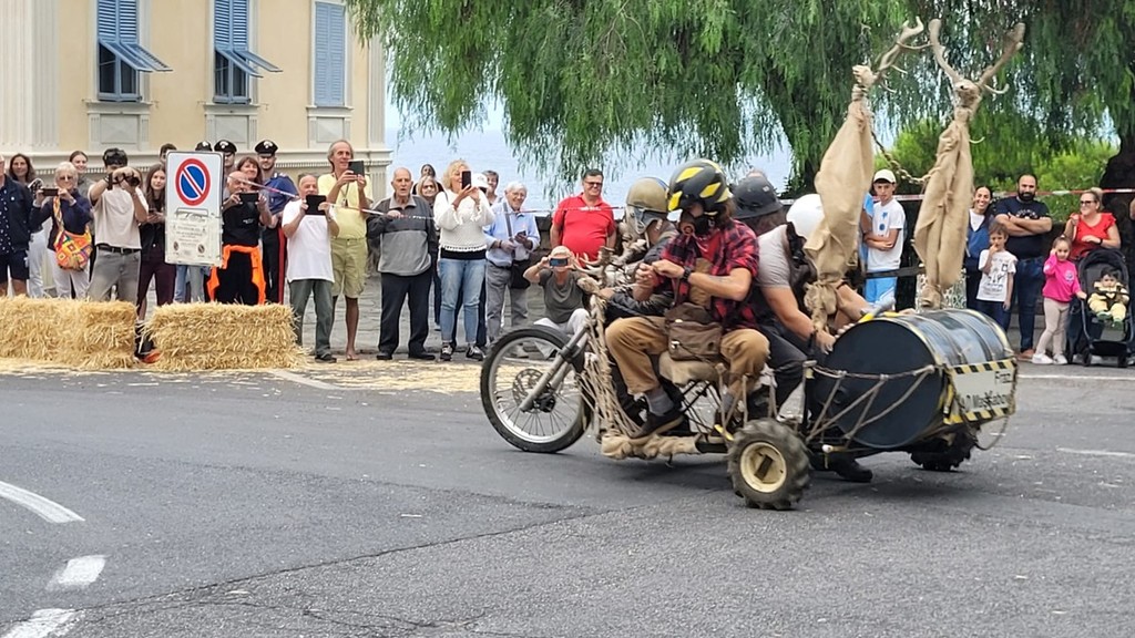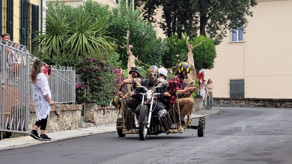 La discesa dal Parasio alla Marina, lungo un percorso tanto affascinante quanto impegnativo, si è trasformata in una passerella di pura follia creativa: dalle carrette a forma di barca pirata a quelle ispirate ai cartoni animati, fino a veri e propri bolidi artigianali, ogni mezzo era una piccola opera d’arte goliardica.