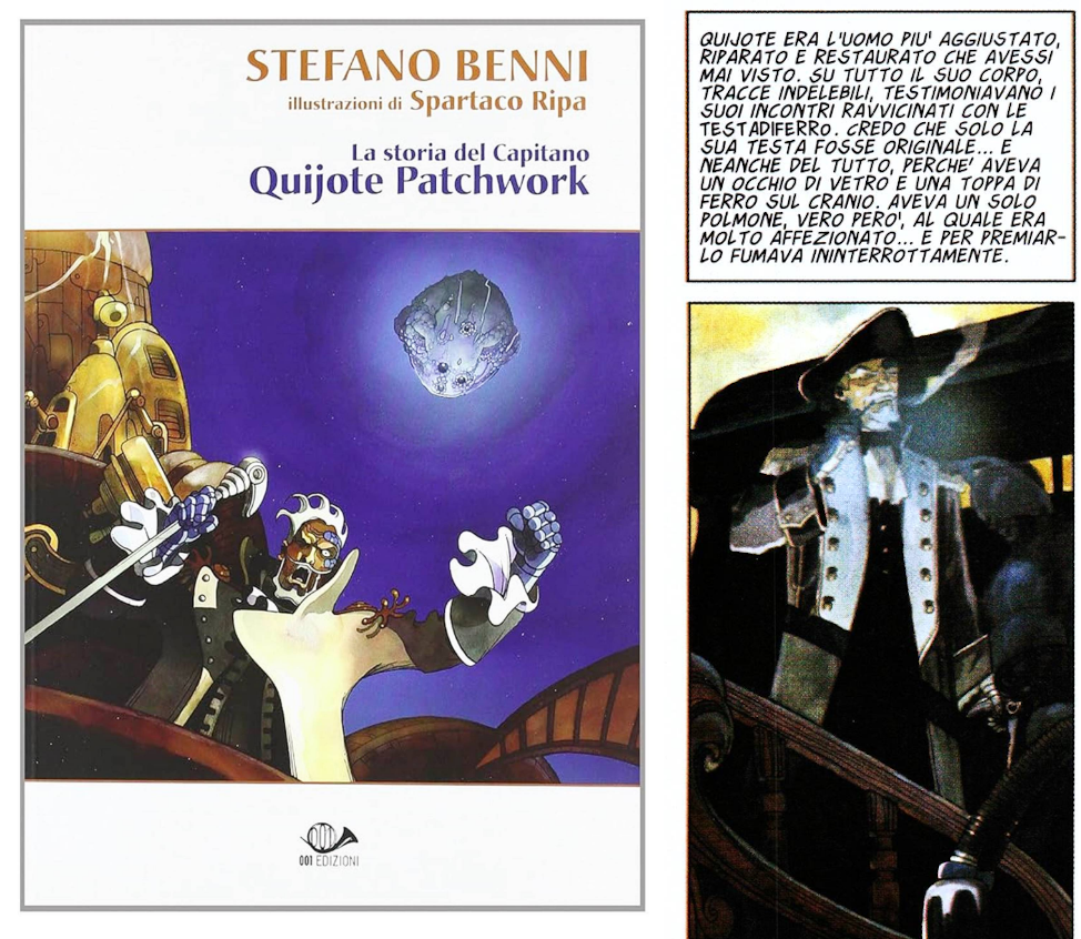 A sinistra, la copertina del volume “La Storia del Capitano Quijote Patchwork” (001 Edizioni). A destra, la vignetta in cui il protagonista compare per la prima volta
