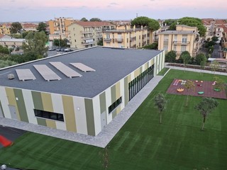 L’edificio si sviluppa su un unico piano di circa 950 metri quadrati e può ospitare fino a 90 bambini (dai 3 ai 5 anni) in tre aule ampie e luminose. Sono stati realizzati anche una mensa moderna, spazi comuni polifunzionali e un grande giardino esterno dedicato alle attività all’aperto. La nuova scuola dell’infanzia è un NZEB (Nearly Zero Energy Building), dunque un edificio a energia quasi zero. Grazie all’impianto fotovoltaico con batterie di accumulo, produce gran parte dell’energia necessaria, riducendo l’impatto ambientale e i consumi. Rispetta inoltre i criteri antisismici, i CAM (Criteri Minimi Ambientali) e il principio DNSH (“Do No Significant Harm”) che prevede che gli interventi previsti dai PNRR nazionali non arrechino nessun danno significativo all’ambiente.