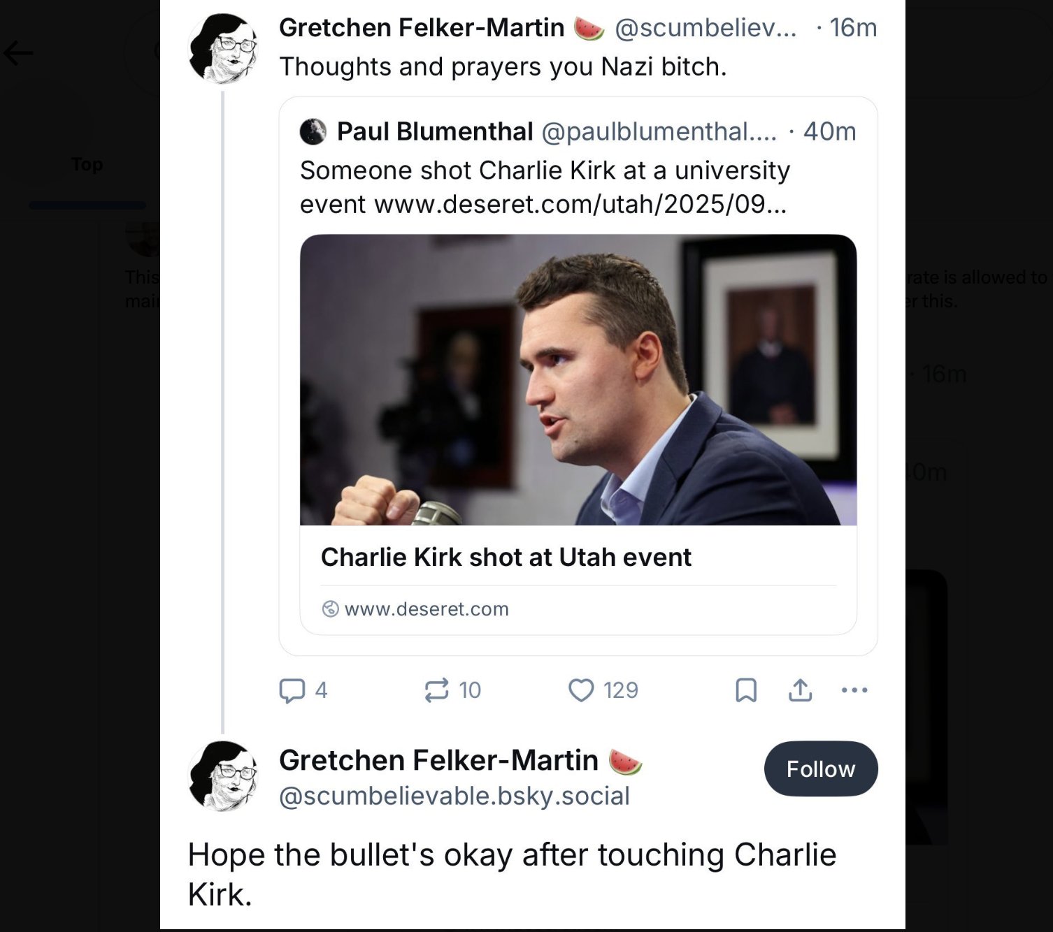 Dal canto suo Gretchen Felker-Martin in post successivi, pur ammettendo di non aver controllato adeguatamente i propri impulsi e di non aver calcolato che le sue parole avrebbero potuto costituire un problema per la DC, non solo non si è scusata, ma ha indicato in modo deciso, in un’intervista, le proprie motivazioni, definendo Kirk "una persona ripugnante”. “Tutti su internet dicono che ha avuto ciò che si meritava” ha aggiunto “E’ morto mentre diffondeva il suo bigottismo, lui stesso aveva auspicato la morte di altri, non ho provato altro che disprezzo per la sua vita. E’ un uomo che per anni ho visto andare in televisione, su enormi palchi e nelle sale delle convention a dire che tutti quelli come me dovrebbero essere lapidati a morte.”