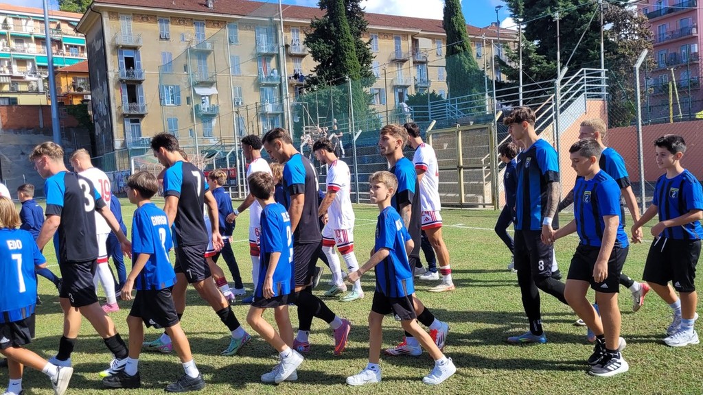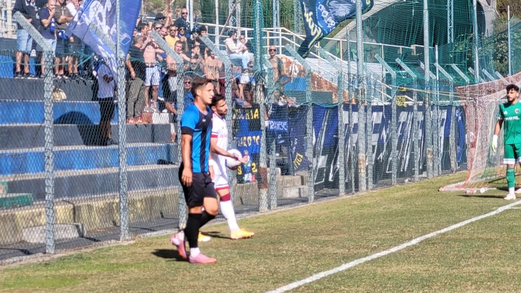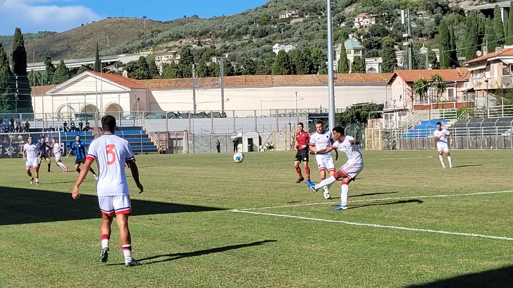 Dopo appena una manciata di secondi, i nerazzurri sono stati costretti a rincorrere: l’arbitro ha fischiato un rigore piuttosto generoso per un presunto fallo di mano (gomito alto su un pallone a mezza altezza, più vicino alla spalla che al braccio). Dal dischetto, gli ospiti non hanno sbagliato, portandosi subito sull’1-0 e gelando il pubblico imperiese.
