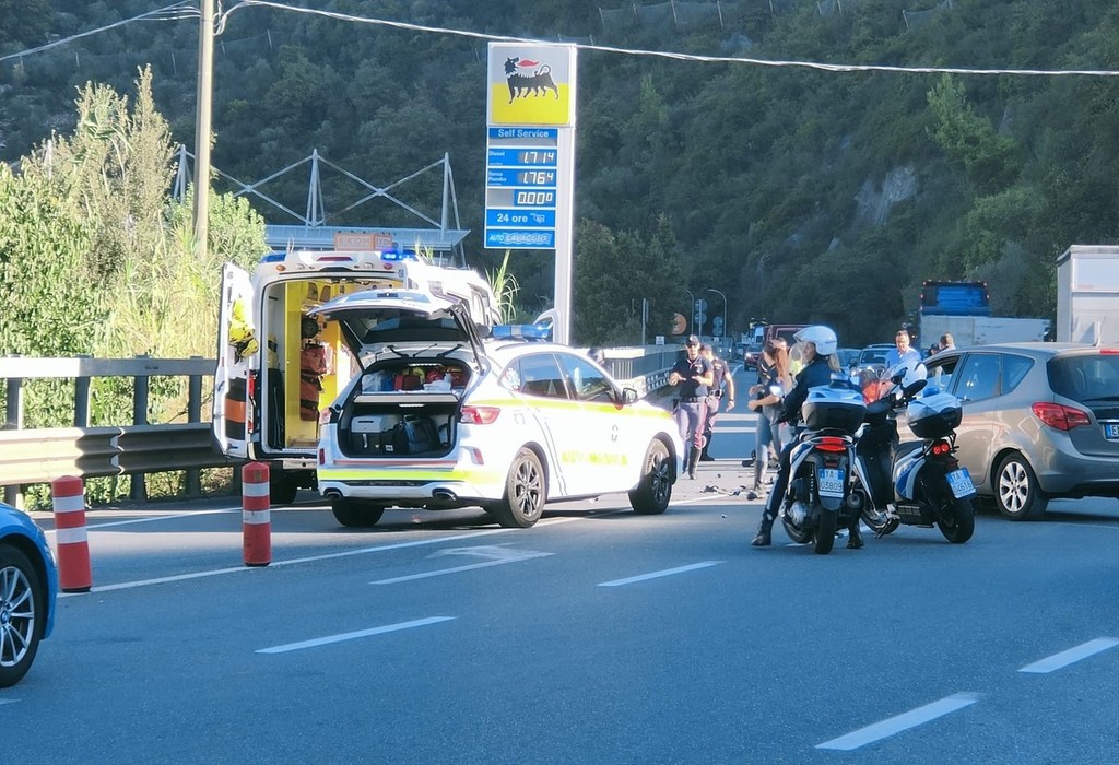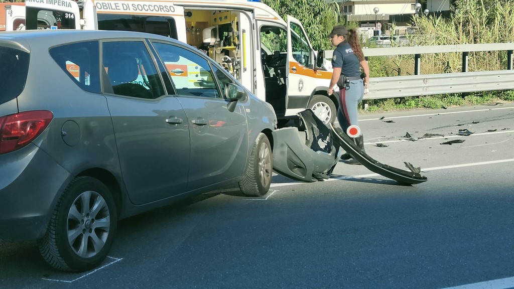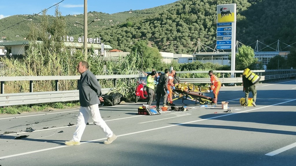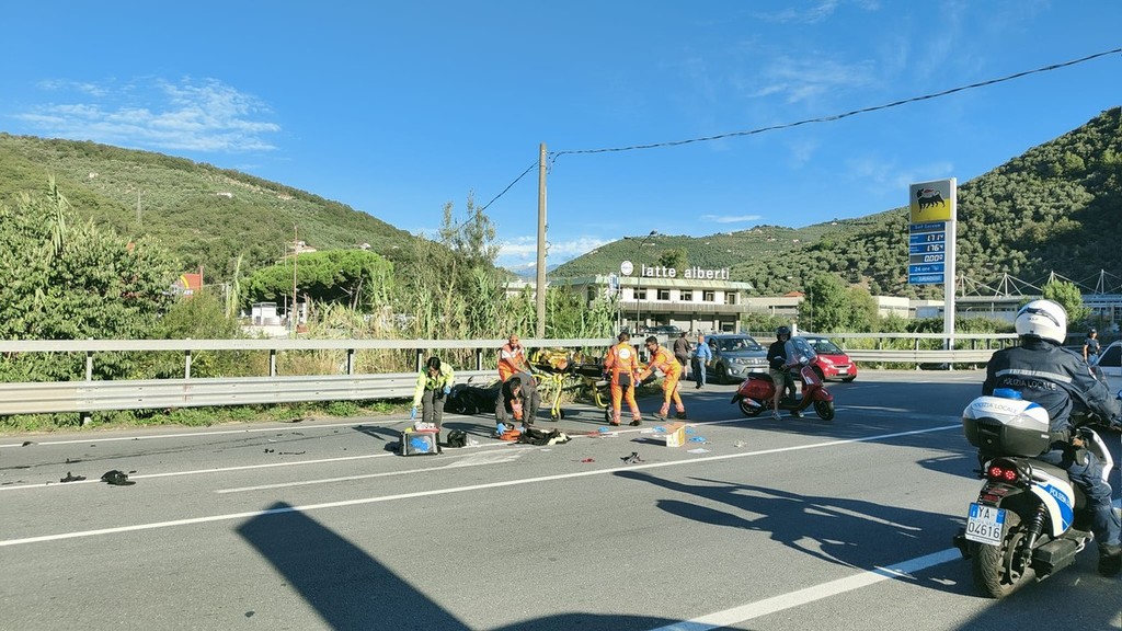 Incidente tra auto e moto in via Nazionale, ferito grave al Santa Corona in elicottero (foto)
