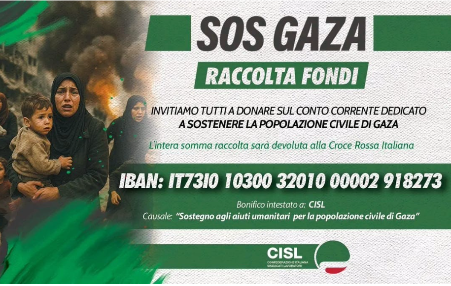 Il contributo può essere versato utilizzando le seguenti coordinate bancarie: IBAN IT73I0103003201000002918273, conto intestato a CISL – Donazione a sostegno aiuti umanitari popolazione civile di Gaza; causale: “Donazione a sostegno aiuti umanitari popolazione civile di Gaza”.