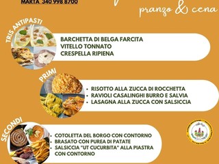 Dalle 12, presso il Palazucca, gli ospiti potranno pranzare scegliendo da un ricco menù alla carta. Regina assoluta sarà la Zucca di Rocchetta, protagonista di piatti come le lasagne zucca e salsiccia, la tradizionale salsiccia ut cucurbita, il risotto alla zucca e golosi dolci, tra cui la crostata con confettura.