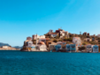 Il pomeriggio dilata i vuoti. Le persiane si socchiudono, il mare cambia gradazione, le facciate delle case rilasciano calore. Si cammina senza una direzione precisa, tra scale ripide, vicoli e cortili nascosti. Kastellorizo è un’opera d’arte urbana che non ha bisogno di pubblico né di applausi. Tra uno scorcio e un balcone fiorito affiora la sagoma del Castello dei Cavalieri, eretto anticamente per controllare la baia. È una sentinella di pietra, memoria di quando questo lembo del Dodecaneso era presidio e frontiera prima che rifugio. Oggi non reclama sguardi, ma li cattura: ricorda, sottovoce, che anche questo luogo ha avuto bisogno di difesa. La vista si apre sull’intera insenatura. Dall’alto il disegno si ricompone: molo, scogli, barche ormeggiate e una linea tesa verso la Turchia, così vicina da sembrare toccabile. Poco oltre, un sentiero conduce alla cappella di San Giorgio, bianca e raccolta, affacciata sull’acqua. È una sosta breve, un invito a prendere fiato.