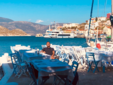 Il porto è la lente attraverso cui tutto si legge. Le imbarcazioni oscillano in un movimento continuo, e il Meltemi — vento caldo dell’Egeo — regala leggerezza ai pensieri. Le sedie rivolte al mare puntano tutte nella stessa direzione, come se l’isola avesse un’unica via di fuga: l’orizzonte. Una viaggiatrice sola, a un tavolo un po’ defilato, osserva in silenzio. Qui si guarda più di quanto si parli. Un uomo apparecchia i tavoli di una taverna: si muove piano, con la calma di chi conosce il valore del tempo e non gli oppone resistenza. Quando si ferma, accenna un sorriso e dice soltanto: «Qui non cambia nulla, è questo il bello». Non aggiunge altro. È abbastanza. In quella frase si condensa la filosofia del luogo: non accelerare, non fingere, non essere altro rispetto a ciò che si è. Il pesce, in tavola, arriva quasi senza mediazioni. Crudo o appena scottato, con olio, limone e capperi carnosi. Il resto è vento e pane da scarpetta. Non c’è scenografia, non c’è narrazione di supporto: si mangia guardando il mare e lasciando che sia il piatto a parlare. Nell’ora di pranzo, Kastellorizo riduce tutto a pochi gesti essenziali.