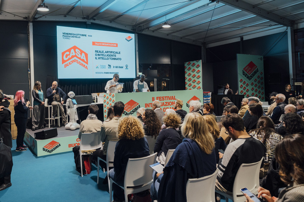 Al centro della sfida, un grande classico della cucina piemontese: il vitello tonnato firmato originariamente dallo chef Matteo Baronetto. Entrambi i contendenti hanno interpretato la ricetta a modo loro, e il pubblico – ignaro dell’autore dei piatti – ha assaggiato “al buio”. Il responso è stato chiaro: 27 voti a 18 per la versione tradizionale e raffinata di Brunetto, che ha avuto la meglio sull’interpretazione creativa di Pepper, il quale ha voluto osare con nocciole, pomodori secchi e senape. Moderato da Fabio Marzano, l’evento non è stato solo una sfida tra uomo e macchina, ma anche un momento di riflessione sul futuro della cucina: un dialogo tra innovazione e tradizione, dove la tecnologia si propone non come avversaria, ma come possibile alleata nella creazione di nuovi orizzonti gastronomici.