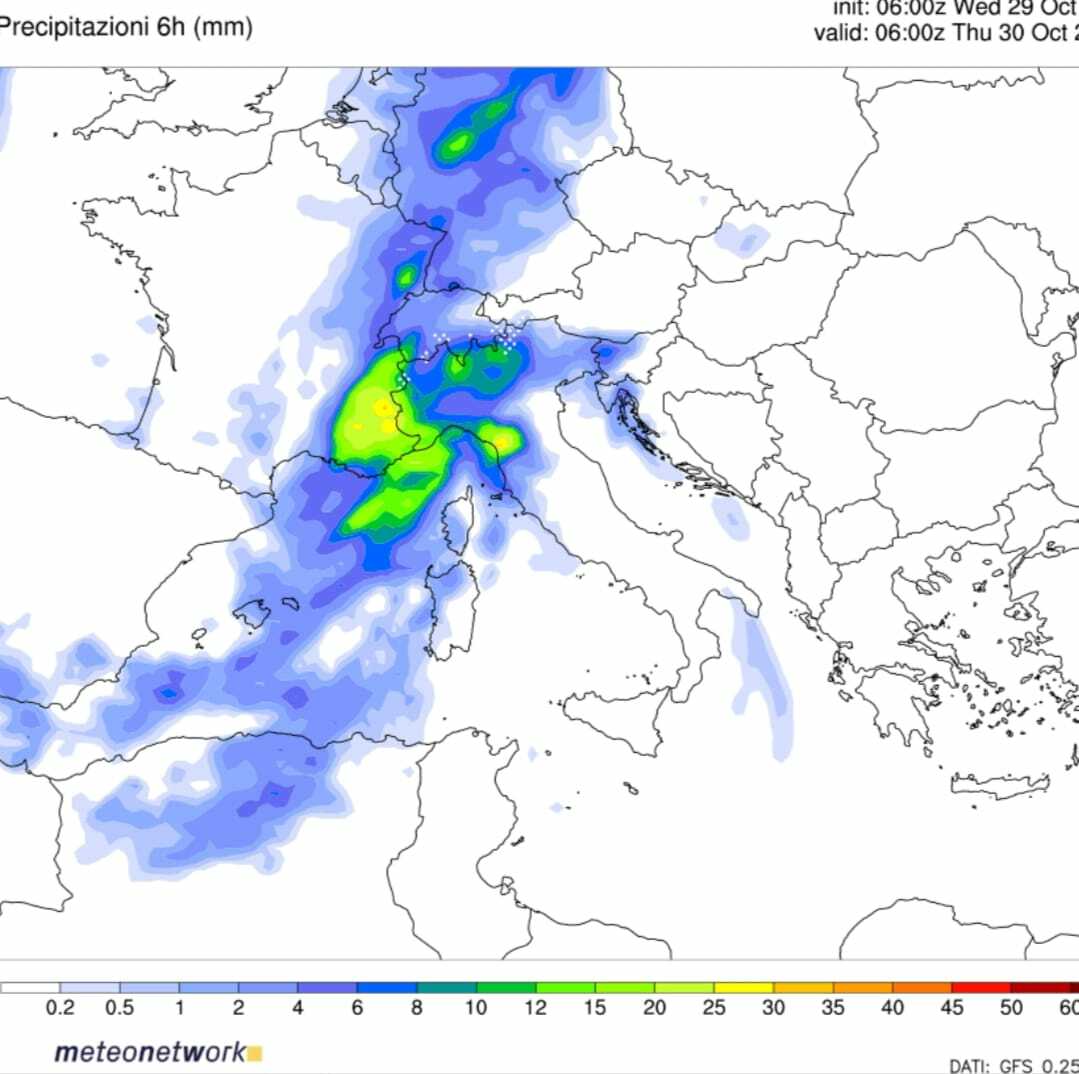 Il maltempo nella mattinata di domani secondo il modello americano GFS. Picco nell' imperiese nel cuore della notte