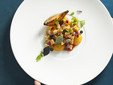Tra i piatti simbolo: il plin ripieno di caprino, l’insalata di piccione ubriaco al Pigato, la panzanella di lievito madre e il risotto alla zucca e orzo tostato con animelle.