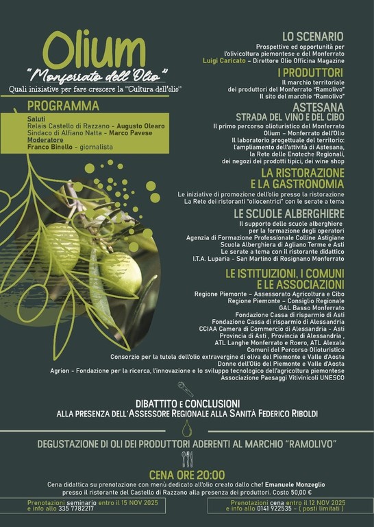 Il Monferrato punta a diventare terra d’olio. Con questo obiettivo nasce “Olium – Monferrato dell’Olio”, una giornata di confronto, degustazione e valorizzazione della produzione olivicola piemontese e del marchio territoriale Ramolivo, organizzata presso il suggestivo Relais Castello di Razzano, ad Alfiano Natta. L’iniziativa mette attorno allo stesso tavolo produttori, istituzioni, ristoratori, scuole alberghiere e realtà associative, con un messaggio chiaro: creare una vera cultura dell’olio anche in Piemonte, affermando il territorio del Monferrato come nuova frontiera dell’olivicoltura italiana.