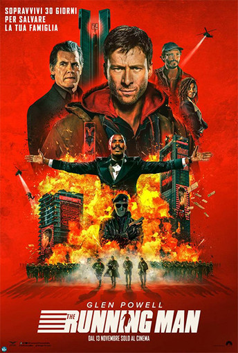 - THE RUNNING MAN – ore 21.30 – di Edgar Wright - con Glen Powell, Josh Brolin, Lee Pace, Katy M. O'Brian, David Zayas - Fantascienza – “The Running Man è il programma televisivo più seguito al mondo: un reality show estremo in cui i concorrenti devono rispettare una sola regola per restare vivi: fuggire per 30 giorni, in diretta tv, braccati da killer professionisti, detti ‘Cacciatori’, mentre il pubblico, incollato agli schermi, esulta a ogni esecuzione e la gente per strada è indotta. Ben Richards non è un eroe. È un uomo qualunque, costretto a una scelta impossibile: entrare nel gioco per salvare la figlia malata. A convincerlo è Dan Killian, il carismatico e spietato produttore dello spettacolo, maestro nel trasformare la sofferenza in spettacolo, la paura in share, la morte in intrattenimento...”