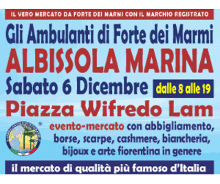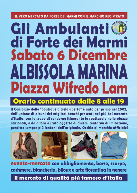 Gli Ambulanti di Forte dei Marmi®, le bancarelle del mercato di qualità più famoso d’Italia, da non confondere con alcuni tentativi di imitazione del loro originale format che circolano anche in regione, tornano finalmente a grandissima richiesta nel Savonese, dopo i recenti successi in tutta Italia, con il loro show itinerante all’insegna del meglio del Made in Italy artigianale e delle ultime tendenze della moda. Si potranno infatti ammirare le ormai mitiche boutique a cielo aperto® dell’originale Consorzio sabato 6 dicembre ad ALBISSOLA MARINA, in Piazza Wifredo Lam. Dunque, un’occasione da non perdere assolutamente per i tanti appassionati del genere che l’hanno a lungo reclamata: una rassegna dello shopping più glamour e conveniente, con orario continuato, anche in caso di maltempo, dalle 8 alle 19.