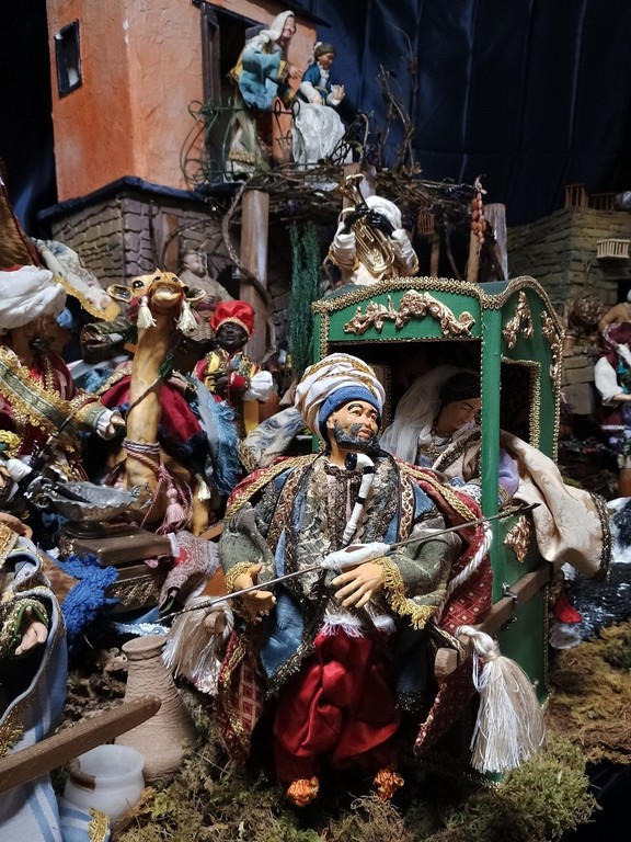 L’opera racconta la quotidianità delle campagne liguri: pastori, contadini, frantoi a sangue e venditori in costumi tipici genovesi e dell’entroterra, tutti minuziosamente realizzati. Al centro della scena, un maestoso corteo dei Magi, accompagnato da servitori, suonatori e un vero e proprio serraglio di animali esotici: cammelli, elefanti, giraffe, struzzi e pavoni animano la scenografia in un tripudio di colori e dettagli.