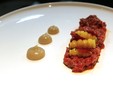 Gli antipasti firmati da Theodor Falser hanno aperto la serata con profondità e rigore: la Tartare di manzo alpino, spuma al burro nocciola, rape nere e grosny e la Crema di topinambur, panna agra, uovo a bassa temperatura e polvere di porcini hanno evocato con forza il paesaggio montano, restituendone complessità e carattere.