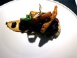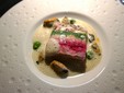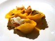 Il viaggio gastronomico ha preso avvio con una delicata amuse-bouche: seppia cotta a bassa temperatura con crema di panissa, un assaggio misurato ed elegante che ha immediatamente tracciato la rotta della serata, fondendo mare e tradizione ligure e predisponendo il palato a un racconto fatto di dialoghi e contaminazioni.