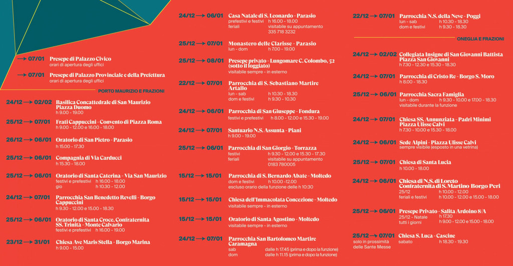 A Porto Maurizio, il presepe della Basilica Concattedrale di San Maurizio è ambientato nella bottega del vasaio, una scelta originale e ricca di significato, nata da una suggestione proposta alla Diocesi dal vescovo Guglielmo Borghetti. Il riferimento è a un celebre passo biblico del profeta Geremia, nel quale Dio invita il profeta a scendere nella bottega del vasaio per comprendere, attraverso il lavoro delle mani, il mistero della creazione e della relazione tra Dio e l’uomo.