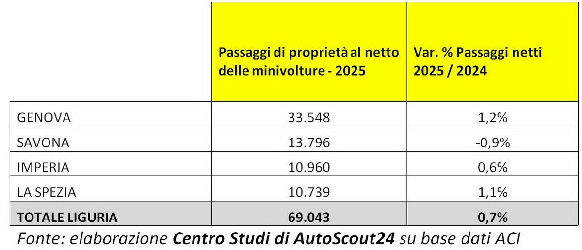 L’aumento dei prezzi delle auto nuove continua a spingere anche gli automobilisti della provincia di Imperia verso il mercato dell’usato, considerato una soluzione più accessibile per guidare modelli recenti e ben equipaggiati senza sforare il budget. Secondo l’elaborazione di AutoScout24 su dati ACI, nel 2025 a Imperia sono stati registrati 10.960 passaggi di proprietà netti, in crescita dello 0,6% rispetto al 2024. Un dato che conferma il buon andamento del mercato locale, in linea con il trend regionale che vede la Liguria chiudere l’anno con 69.043 passaggi complessivi (+0,7%).