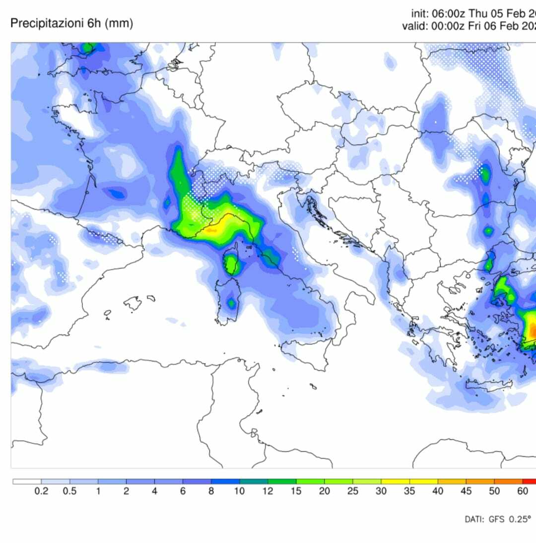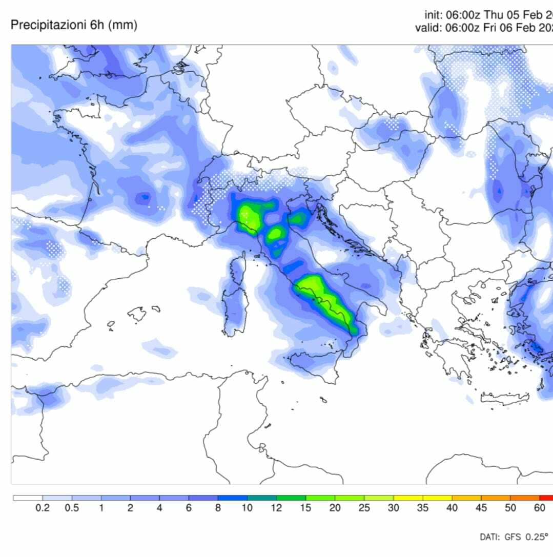 Il clou ( modello americano GFS) del passaggio perturbato che arriverà in serata e sarà articolato nel cuore della notte