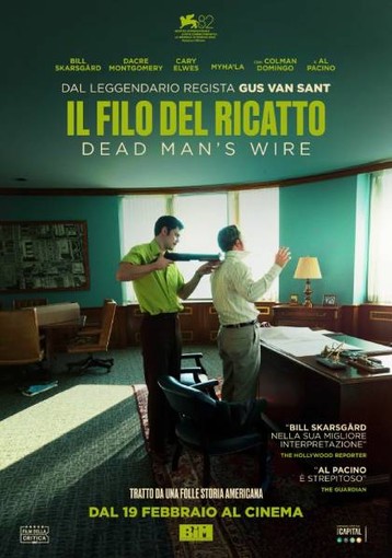 - IL FILO DEL RICATTO – ore 16.30 - 21.15 – di Gus Van Sant - con Bill Skarsgård, Dacre Montgomery, Al Pacino, Colman Domingo, Myha'la Herrold – Drammatico/Storico – “La mattina dell'8 febbraio del 1977, nello stato dell'Indiana, Anthony Kiritsis, detto Tony, quarantaquattro anni, entra nell'ufficio del presidente della Meridian Mortgage Company e, in sua assenza, prende in ostaggio il figlio e socio in affari, Richard O. Hall, legandogli al collo un cavo teso collegato al grilletto di un fucile a canne mozze calibro 12 (il ‘dead man's wire’ del titolo). Chiede cinque milioni di dollari, come risarcimento per essere stato ingannato dall'agenzia e derubato del profitto che avrebbe fatto vendendo il suo terreno se la Meridian Mortgage non lo avesse deliberatamente ostacolato; chiede di non essere accusato né processato; esige delle scuse personali da parte di Hall senior, che ritiene il diretto responsabile della sua disgrazia. Il lungo negoziato telefonico tra rapitore e forze dell'ordine attrae come un magnete altre vite e altre storie: quella del conduttore radiofonico afroamericano Fred Temple, "the voice of Indianapolis", che parla con Tony in diretta, e di una giovane giornalista televisiva in cerca dell'occasione giusta per essere lanciata in prime time. Il cavo del telefono, della radio e della televisione, dunque, come emblema di ciò che connette, nella diversità di sorti ed esistenze...”