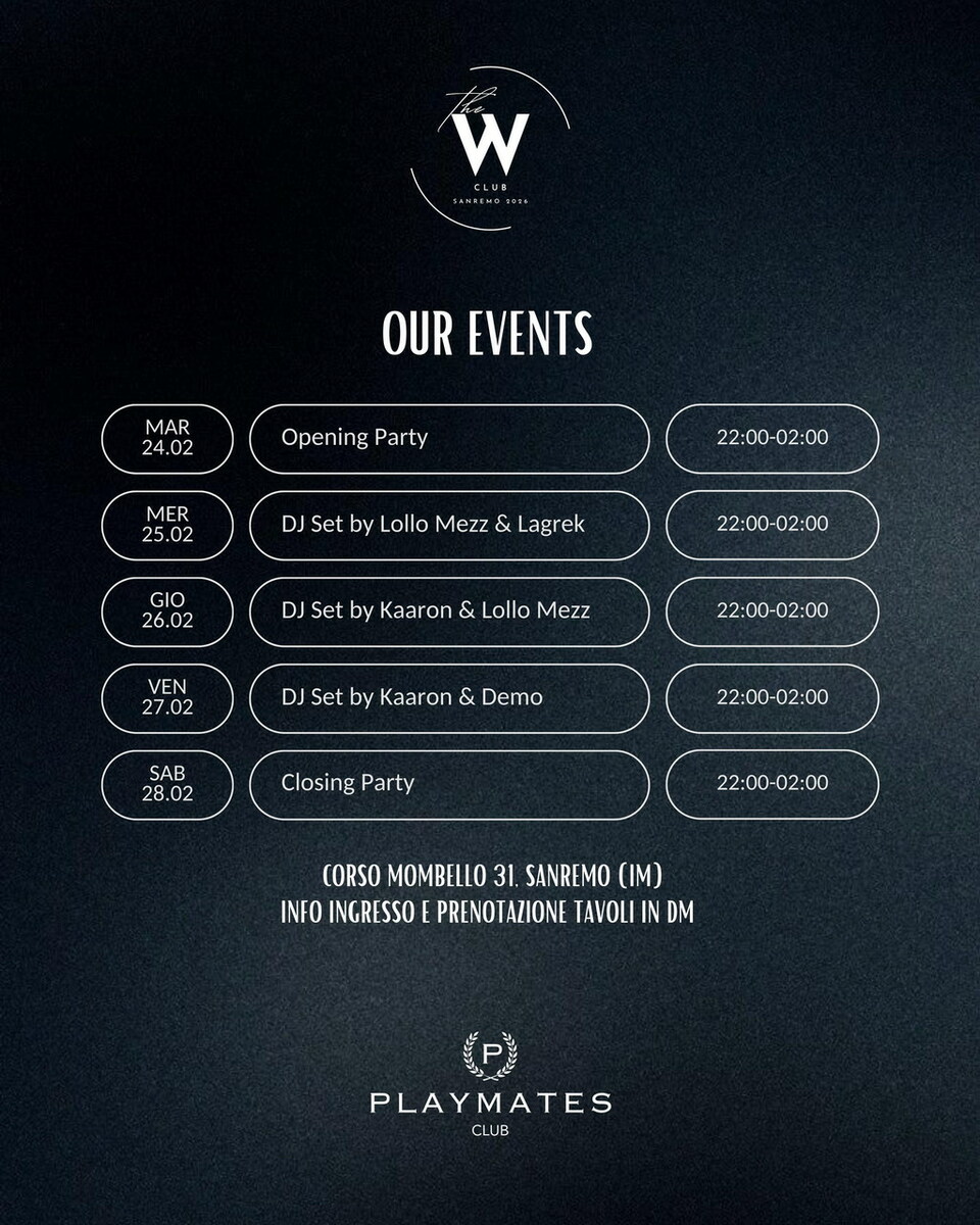 Il W Club nasce come spazio temporaneo, ma con l’ambizione di diventare un punto di riferimento per chi cerca un luogo giovane, dinamico e in linea con le nuove tendenze del divertimento. Durante il Festival, sarà uno dei poli più attivi della città, grazie a un mix di musica, socialità e ritmo che promette di animare le serate sanremesi.