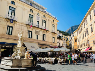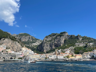 Proseguendo in battello, si arriva a Positano. L’immagine più diffusa e iconica della Costiera. Dal mare si presenta come una diagonale netta: una sequenza ordinata di volumi, tra rosa pallido, pesca e bianco. Terrazze sovrapposte e balconi fioriti costruiscono un’immagine riconoscibile, modellata sul profilo del promontorio. L’impatto visivo è forte e coerente. L’economia locale è fortemente orientata all’accoglienza: boutique, hotel panoramici e ristoranti affacciati sul mare testimoniano una trasformazione che ha consolidato la vocazione turistica del paese. La bellezza è organizzata e resa esperienza strutturata.
