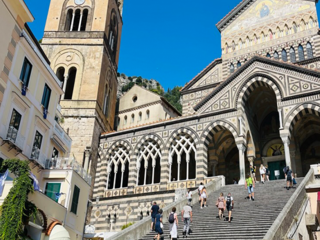 Osservata dal mare, diventa più leggibile. I Paesi appaiono come incastri geometrici sospesi, le terrazze agricole come gradini scolpiti nei versanti, la via costiera come una linea sottile ritagliata nella pietra. Dal largo si coglie un sistema costruito contro la gravità, dove nulla è casuale e ogni spazio è stato conquistato. Vietri sul Mare rappresenta la soglia della Costiera. È il punto in cui il paesaggio conserva ancora una certa apertura e la verticalità non è dominante. Le cupole maiolicate riflettono la luce con intensità, le facciate colorate dialogano con il cielo e con il mare. La tradizione della ceramica costituisce l’elemento più evidente: botteghe e laboratori raccontano una continuità artigiana che ha dato al luogo una riconoscibilità internazionale. Andando oltre, la morfologia cambia rapidamente. Partendo via mare, tutto si avvicina. Amalfi appare all’improvviso, raccolta e quasi protetta da “madre natura”. Una parete di case color crema e giallo che sale una sopra l’altra, senza spazi vuoti. La spiaggia è una mezzaluna compatta, il porto un incastro preciso di moli e barche. Sbarcare significa entrare in un sistema verticale. La scalinata del Duomo domina la piazza e segna la direzione: verso l’alto. Ma basta infilarsi in un vicolo per sentire la vera natura del luogo. Archi bassi, muri segnati dal tempo, intonaci che portano tracce di umidità e sale. Le finestre sono ravvicinate, le pareti quasi si sfiorano.